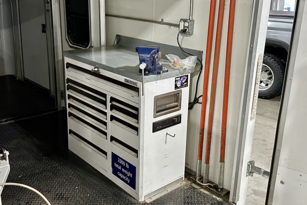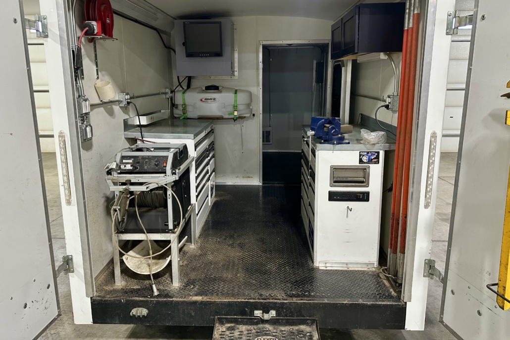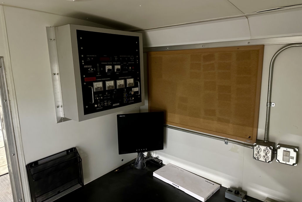 This used Aries camera trailer has been meticulously maintained and is loaded with great features. It comes with a full Aries Pathfinder mainline system, including two tractors and a camera, but it can be easily upgraded to the new Voyager system. Amenities include a sanitizing system, Heat, AC, and a large office space.